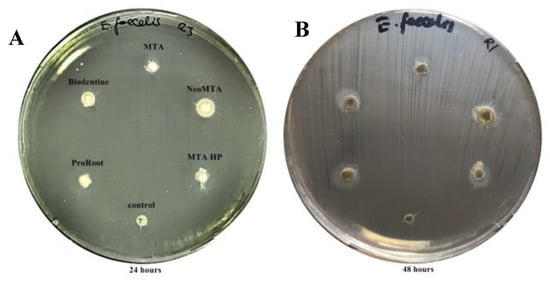 Zone of inhibition of five calcium silicate-based cements against E. faecalis. (A) inhibition zones of all calcium silicate-based cements at 24 h, (B) inhibition zones of all calcium silicate-based cements at 48 h.