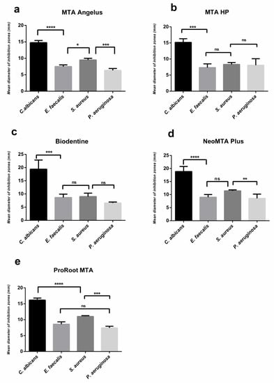Inhibitory effect of each tested cement against per microorganism at the end of 48h. Results are expressed as mean values + SD (**** p < 0.0001; ***, p < 0.001; **, p < 0.01; *, p < 0.05; ns: no significance). (a) Inhibitory effect of MTA Angelus, (b) Inhibitory effect of MTA HP, (c) Inhibitory effect of Biodentine, (d) Inhibitory effect of NeoMTA Plus, (e) Inhibitory effect of ProRoot MTA.