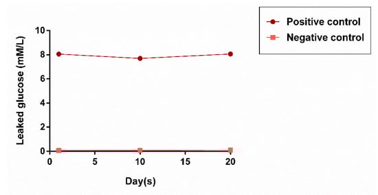 Glucose leakage per experimental group for 20 days. Results are expressed as mean values + SEM. Two-way ANOVA followed by Tukey’ s post-hoc test was used for statistical analysis to compare the results per group at 1st, 10th, and 20th days (***, p < 0.001; **, p < 0.01; *, p < 0.05; no asterisks, not significantly different).
