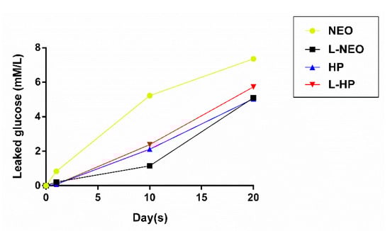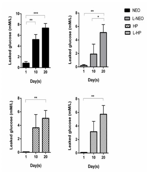 According to the intragroup analysis of the Neo group, the lowest amount of glucose leakage (0.835 ± 0.973) was observed at the end of day 1. The amount of leakage was statistically significant compared to day 10 (5.220 ± 2.939, p < 0.01) and day 20 (7.356 ± 2.660, p < 0.001). No significant differences were detected between day 10 and day 20 of the Neo group (p > 0.05). In the L-Neo group, the greatest amount of glucose leakage was on day 20 (5.099 ± 3.752). The amount of leakage on day 20 was significantly higher when compared to that of day 10 (1.908 ± 4.665, p < 0.05) and day 1 (0.219 ± 0.398, p < 0.01).