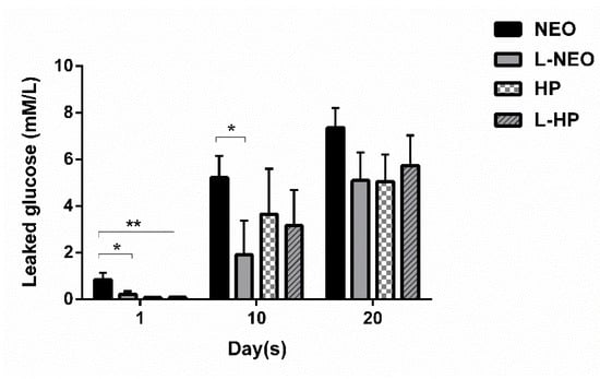 Glucose leakage across experimental groups at 1st, 10th, and 20th days. Results are expressed as mean values + SEM. Kruskal–Wallis, and Dunn’s post-hoc test was used for statistical analysis to compare the results across groups at 1st, 10th, and 20th days. (**, p < 0.01; *, p < 0.05; no asterisks, not significantly different).