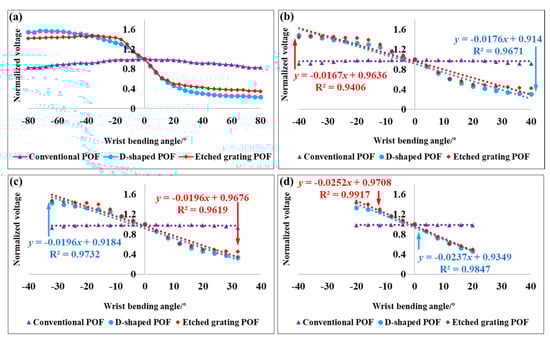 In order to more accurately probe the bending sensitivity that is enhanced using the developed sensors, the angle experiments within various ranges of ±40°, ±32° and ±20° were performed, respectively. By comparison with Figure 3b–d, it can be clearly concluded that the conventional POF is improper for wrist motion monitoring, due to its extremely low angle sensitivity, which is almost zero. The normalized sensitivity of D-shaped POF increased to 0.0196/° and then to 0.0237/° from 0.0176/°, as the angle reduced from the initial ±40° to ±32° and then ±20°, with the corresponding rising rates of 11.4% and 34.7%, along with excellent goodness of fits larger than 96% by using the least squares fitting method. By contrast, the normalized sensitivity of etched grating POF also reached to 0.0196/° and then 0.0252/° from the beginning of 0.0167/°, with great goodness of fits of exceeding 94%; however, the corresponding rising rates distinctly raised by 17.4% and 50.9%, as listed in Table 1. Therefore, it can be inferred that the etched grating POF is superior to the D-shaped POF at a lower bending angle range, but the latter is inclined to have better sensitivity and linearity as the bending angle becomes larger. The phenomenon is primarily due to a more evanescent field interaction with the side-polished fiber surrounded by air, especially when larger fiber curvature variations occur.