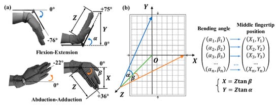 where α and β are the angles between the Z-axis and the movement positions of hand in the Y-axis and the X-axis, respectively. In this way, with the aid of Equation (4) and the given coordinate (X, Y), the bending angle for calibrating wrist movement can be determined.