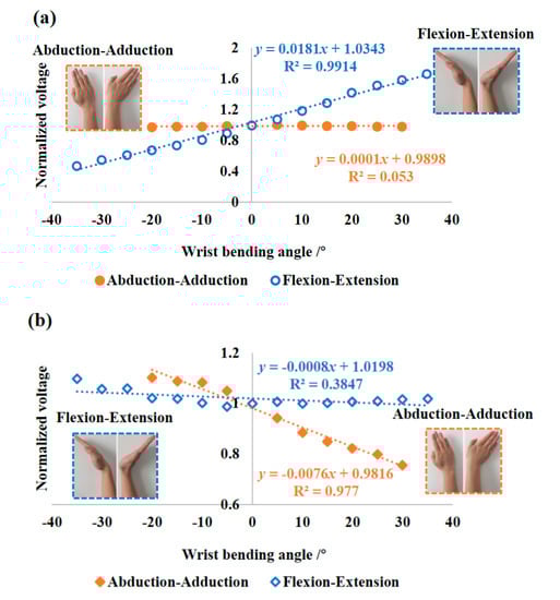 It can be seen in Figure 5a that the side-polished D-shaped POF was insensitive to the abduction-adduction movement; however, it exhibited a normalized angle sensitivity of 0.018/° (R2 = 0.991) for the flexion-extension movement in the tested angle range, which can be approximated as: