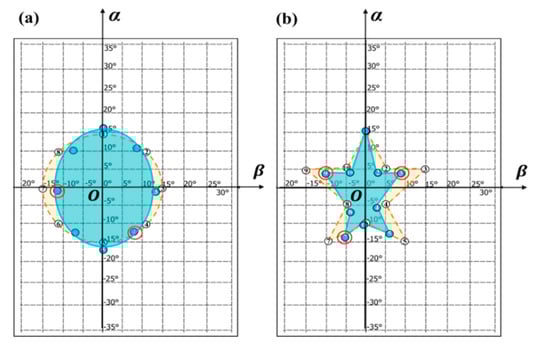 To further intuitively evaluate the presented dual POF sensors in wrist spatial movement detection, simple graphs, such as round and pentagon, were drawn by wrist postures of a tester. Circular and pentagonal patterns represent the arc-shaped and broken line-shaped trajectories of wrist joint, respectively. Thus, the two patterns can be used to comparatively evaluate the influence of bending angle variation on the stability and sensitivity of the sensor assembly in different wrist motion modes made up of typical line-shaped and arc-shaped movements. Then, according to the recovered graphs, three degree-of-freedom movements of wrist joint for the developed optical fiber wearable sensor can be effectively investigated. As illustrated in Figure 6, the predetermined circular and pentagonal wrist motion trajectory patterns were denoted by yellow dashed lines, on which eight and 10 discrete measurement points concerned with wrist joint compound motions were, respectively, labeled on a rigid plate marked with α and β coordinate scales. It is worth noting that the position coordinate (X, Y) in Figure 4b can be transformed to the angle coordinate (α, β) in Figure 6, on the basis of Equation (4). In this case, these discrete angle measurement points are set in the α-β plane. Then, in the initial state, the middle fingertip of a tester’s hand was made to contact with the origin (O) of the coordinates, while keeping horizontal. At this point, the initial output voltage V0 for each of the two POF sensors was sampled. Regarding the predefined eight or 10 angle measurement points, the sensor output voltage Vθ was collected one by one in a clockwise direction via dual channel synchronous acquisition. The experiments were repeated three times. In terms of the calibrated relationship between normalized voltage output and bending angle as given in Equations (5) and (6), the bending angles α and β can be solved by the measured averaged values (ND-POF or NE-POF) at each set angle points. Then a least-square polynomial fitting method was used to recover the graphs from the extracted angle data, as depicted by blue solid lines in Figure 6.