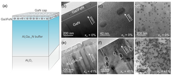 The main structural differences between the GaFeN layers grown on GaN and those deposited on the AlGaN buffers are summarized in Figure 1, where the overall sample structure, including TEM cross-section and plan-view images for the reference sample ( = 0%) and for the sample with the highest Al concentration = 41% are reported. A comparison between the overview cross-section images presented in Figure 1b,e reveals a dislocation density in the AlGaN buffer larger than the one in GaN, affecting the nanocrystal distribution in the GaFeN overlayer. As a consequence, the NCs are not all localized in one plane like those embedded in the layer grown on GaN, as demonstrated in the TEM micrographs reproduced in Figure 1c,f. It is further observed that the majority of the NCs in the GaFeN/AlGaN sample form at the end of dislocations propagating from the buffer, in contrast to the NCs in the layer grown on GaN, which are embedded in the GaFeN matrix volume. This is visualized in the plan-view images presented in Figure 1d,g, where NCs with a round-shaped contour, distributed homogeneously in the plane with an average distance of (20–100) nm between nanocrystals, are observed. The NCs density increases from (5.0 ± 0.2) NCs/cm for the reference sample to (5.0 ± 0.3) NCs/cm for the sample grown on the AlGaN buffer. Besides an increased NC density, there is a complex dislocation network connecting the NCs observed for the GaFeN layer grown on the AlGaN buffer.