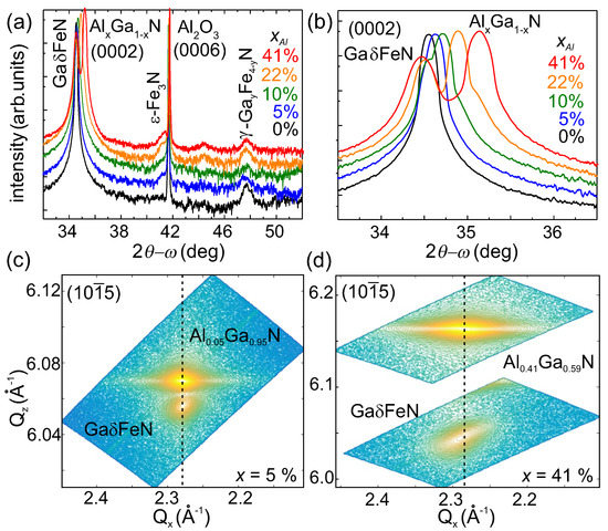 (a) Radial 2- scans collected along the growth direction with the diffraction peaks identified for the AlGaN buffer, the GaFeN layers and the embedded nanocrystal phases [28,29]. (b) Close-up of the (0002) diffraction peaks of the AlGaN buffer and of the GaFeN layers. (c,d) Reciprocal space maps of the diffraction plane for the samples containing 5% and 41% Al in the buffer, respectively.