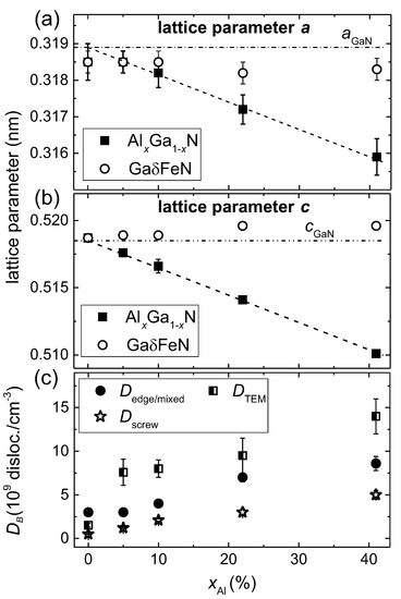 (a,b): Lattice parameters a and c of the AlGaN buffer (full squares) and the GaFeN layers (empty circles) vs.. The dashed line corresponds to the Vegard’s law and the dashed-dotted line indicates the literature values of the lattice parameters a and c for GaN [31]. (c) Dislocation densities—edge-mixed (full circles) and screw (empty stars)—in the AlGaN buffer layers estimated from XRD and TEM (half-filled squares) as a function of .