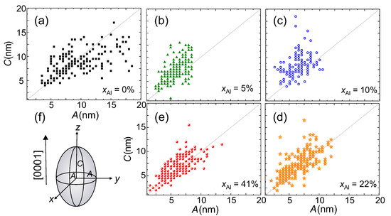 A more detailed analysis of the NCs sizes is performed on cross-section and plan-view TEM images. The size of the NCs is determined with an accuracy of ±0.5 nm by measuring the size of the areas where Moiré patterns are visible with the Fiji software [34]. The results are presented in Figure 4a–e, where the size distribution of 200 measured NCs per sample is reported. For this evaluation, the NCs are treated as ellipsoids according to the schematic representation in Figure 4f with dimensions perpendicular (A) and parallel (C) to the growth direction for the different in the buffers. The solid line marks the aspect ratio (AR) equal to 1, i.e., . From the size distributions presented in Figure 4, it is seen that the size of the NCs in the reference sample has a broader distribution and particularly a larger in-plane A than in the samples grown on the AlGaN buffers. Although the size of the NCs in the reference sample tends to lie on or below the solid line, indicating an AR≤1 and an oblate shape of the NCs—with their y-axis elongated in the plane of the layer—the size of the NCs in the layers grown on the AlGaN buffers lies above the solid line, i.e., with an AR>1, pointing at prolate NCs elongated along the growth direction. From the measured dimensions of the NCs, the average sizes parallel and perpendicular to the growth direction are estimated, confirming the decrease in the size perpendicular to the growth direction for the nanocrystals embedded in the GaFeN layers grown on the AlGaN buffers.