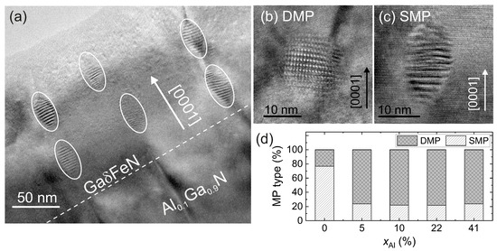 In addition to providing the size and phase, the characterization of the Moiré patterns (MPs) observed in the HRTEM micrographs yields further relevant information about the embedded NCs. The origin of MPs in general is the result of the overlap of two lattices with equal spacings that are rotated with respect to each other, or of the superposition of lattices with slightly different spacings. This leads to a pattern with Moiré fringe spacings with either single periodicity (line pattern) or double periodicity (grid-like pattern). Exemplary NCs showing a double and a single MP are presented in Figure 5b,c, respectively. The Moiré fringe spacings depend on the two underlying crystal structures, on their orientation relationship, and on the lattice strain. The fraction of nanocrystals displaying single MP (SMP) and double MPs (DMP) is shown in Figure 5d. Up to 78% of the NCs exhibit single MPs and 22% produce double MPs in the reference GaFeN grown on GaN buffer, while for the films grown on the AlGaN buffers this tendency is inverted. The double MP pattern is an indication of an in-plane misorientation of the NCs, which is related to the enhanced dislocation density in the underlying buffer layers and to the formation of the NCs along the dislocations, leading to slight distortions and strain within the GaN matrix.