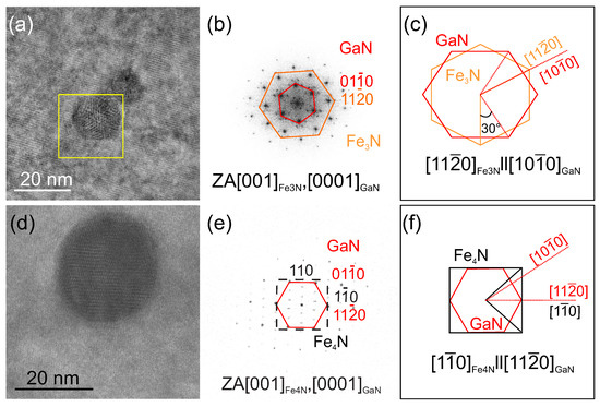 Plan-view HRTEM images of exemplary FeN nanocrystals embedded in a GaFeN layer grown on (a) an AlGaN buffer, and (d) GaN. (b,e) FFT of the images presented in (a,d), respectively, showing the epitaxial orientation of the NCs with respect to the GaN matrix. The FFT in (c) corresponds to the NCs marked by the square in (a). (c,f): Schematic representation of the epitaxial relation in (b,e).