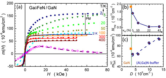 Having established in each of the investigated structures, the paramagnetic contribution —where g is the g-factor and the Bohr magneton—is calculated and subtracted from the experimental data to obtain the magnitude of the magnetization corresponding to the NCs. The results are indicated by solid lines in Figure 7. It is worth noting that saturates at all investigated temperatures for kOe, confirming the ferromagnetic order within the NCs. The evolution of and as a function of the dislocation density is presented in Figure 7b,c, respectively. The former decreases, whereas the latter increases with the dislocation density, suggesting that the dislocations originating at the sapphire/AlGaN interface serve as preferential sites for the aggregation of the Fe ions. This is substantiated by the fact that the magnitude of in the reference structure and related solely to the layer nominally containing Fe, i.e., (60–100) nm, corresponds to () cm or % of Fe ions, largely exceeding the Fe solubility limit in GaN. Thus, the Fe ions are distributed across the entire depth in the structure of the reference sample, whereas in the layers grown on the AlGaN buffers a significant fraction of the Fe ions migrates to the dislocations, where they aggregate into the hexagonal -FeN NCs. Since the dislocation density is found to correlate with the Al content in the buffer, as presented in Figure 3c, the Al content in the AlGaN buffer is instrumental to control both the substitutional Fe atoms concentration and the strength of the ferromagnetic signatures related to the NCs.