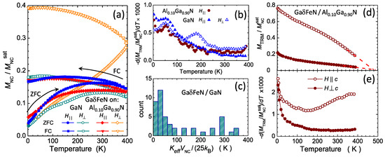 The magnetothermal behavior of these ensembles of NCs traced for two orientations of H, i.e., parallel (full symbols) and perpendicular (open symbols) to the film plane is shown in Figure 9a and follows a trend specific to ferromagnetic nanoparticle ensembles previously reported for Fe-rich NCs stabilized in GaN [18,37,38]. These features indicate that independently of the orientation, a specific distribution of energy barriers for the ferromagnetic moment reversal determines the response in the whole temperature range. Here is the effective magnetic anisotropy energy density specific to a given NC with volume . The effect is particularly significant in the GaFeN/AlGaN layer for . This finding demonstrates that the predominantly prolate character of the -FeN NCs in the layers grown on the AlGaN buffers dramatically affects the magnetic anisotropy (MA), which will be treated in detail later.