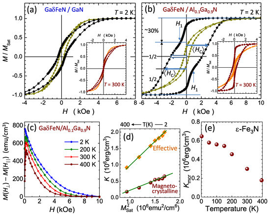 The normalized magnetization of the layers as a function of the magnetic field is presented in Figure 10a,b, where both and show the sensitivity of the magnetization to the orientation of H for the reference structure and for the GaFeN/AlGaN layer, respectively. The measured saturates beyond kOe and does not significantly depend on H in the whole studied T-range, as demonstrated earlier in Figure 7a for the reference sample and in previous studies [19,24]. A similar behavior is observed for all the layers deposited on the AlGaN buffers.