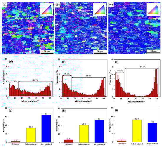 Electron backscattered diffraction (EBSD)maps (top surface layer (ED–TD) plane) of grain orientation and distribution of grain boundary angles and recrystallization microstructures of alloys with different Zn/Mg ratios (a,d,g) 1# alloy; (b,e,h) 2# alloy; (c,f,i) 3# alloy.