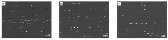 SEM images and EDS results of alloys with different Zn/Mg ratio are shown in Figure 3. White irregular coarse second phases were distributed unevenly along the extrusion direction. EDS results indicated that white coarse second phases are mainly the AlFeMnSi phase, while small amount of Mg element and large amount of Zn element dissolved into the matrix. The amount of second phases in multiple fields of view were calculate by the Image J software. When the Zn/Mg ratio was 11.4, 8.1 and 6.1, the number density of the coarse second phases would be 9609 mm−2, 7852 mm−2 and 5216 mm−2, respectively. AlFeMnSi phases also contained Zn elements, as the EDS results in Figure 3d–f showed. With less Zn content in the matrix, there would be less coarse second phases. Results in Figure 3a–c indicated that the amount of noncoarse particles decreased with the increase of Mg content. Therefore, the fraction of the coarse second phases significantly decreased with the decrease of the Zn/Mg ratio.