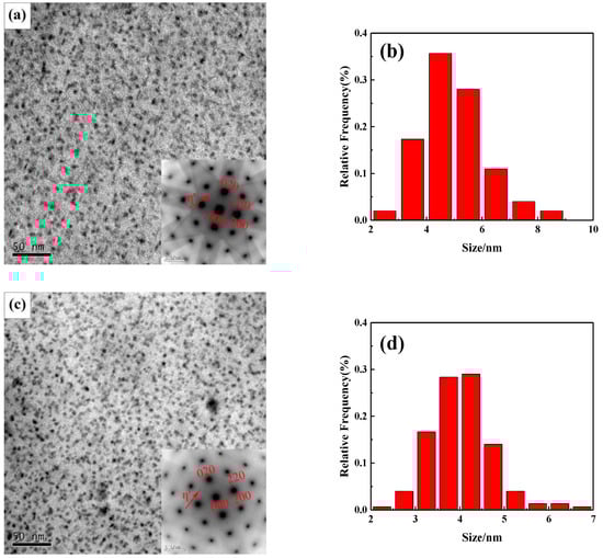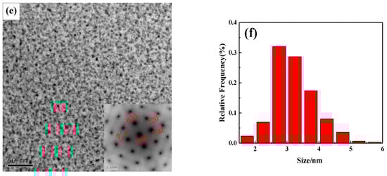 Figure 4a,c,e show the TEM images of precipitated phases in alloys with different Zn/Mg ratios and the electron incident direction was < 100 > Al. After the T6 heat treatment, short rod-shaped second phase particles precipitated uniformly in grain interior. It can be estimated as η’ phase from the selected area electron diffraction (SED) map. The number density of precipitates was counted by Image J software. Results showed that the number density of η’ phases in the grain interior significantly increased with the decrease of the Zn/Mg ratio. For the Zn/Mg ratio was 11.4, 8.1 and 6.1, the number density of η’ phases is 66,521 μm−2, 87,863 μm−2 and 118,142 μm−2, respectively. The size of η’ phases was measured and proportions of size was obtained through the normal distribution calculation method. As shown in Figure 4b,d,f, when the Zn/Mg ratio is 11.4, the size of η’ phases was 4–6 nm. When the Zn/Mg is 8.1, the size of η’ phases was 3.5–4.5 nm. When the Zn/Mg ratio was 6.1, the size of η’ phased was 2.5–3.9 nm. Results indicated that the size of η’ phases significantly decreased with the decrease of the Zn/Mg ratio.