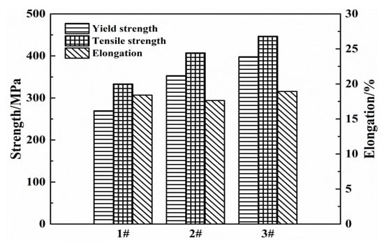 The main strengthening mechanism of Al-Zn-Mg alloys is the precipitation strengthening and the metastable η’ phase is mainly precipitated in the peak aging state (T6) []. The strengthening mechanism is that the dislocation line bypass through η’ phases, which increase the resistance of dislocation movement. With the decrease of Zn/Mg ratio, the number density of η’ phases increases, thus the resistance of dislocation movement increases. The calculating result of precipitation strengthening was listed in Table 4.