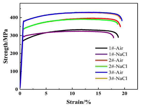 Figure 8 shows the stress-strain curves obtained by slow strain rate tests of alloys with different Zn/Mg ratios in air and in the 3.5 wt% NaCl solution. The corrosion environment will lead to the decrease of the elongation and the extent of the decrease is various with different Zn/Mg ratios. As shown in Figure 8, the elongation of the alloy with the Zn/Mg ratio is 11.4 was significantly lower in NaCl solution than in the air. When the Zn/Mg ratio was reduced to 8.1 or 6.1, the elongation in air and NaCl solution environment has less difference. The slow strain rate results are shown in Table 5. When the Zn/Mg ratio was 11.4, the tensile strength in NaCl solution decreased by 8.0 MPa compared with that in air and the elongation decreased by 5.0%. When the Zn/Mg ratio was 8.1, the tensile strength decreased by 4.5 MPa and the elongation decreased by 2.6%. When the Zn/Mg ratio was 6.1, the tensile strength decreased by 2.1 MPa and the elongation decreased by 1.5%. When the Zn/Mg ratio is 11.4, 8.1 and 6.1, the stress corrosion sensitivity index is 0.031, 0.015 and 0.007, respectively. The stress corrosion resistance of Al-Zn-Mg alloys was improved with the decrease of the Zn/Mg ratio.