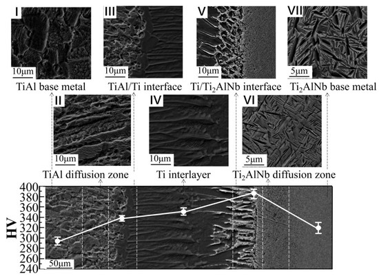 The microstructures of the as-welded joints are shown in Figure 3. No welding defects were observed at the as-welded bonding interface of TiAl and Ti2AlNb in terms of microholes, microcracks, poor bonding, or other anomalies. Furthermore, a trend of microstructural variation was noticed from TiAl to Ti2AlNb. The width of the bonding interface was estimated to be 150 μm. To simplify the description of the results, the joint was divided into seven zones: the TiAl base metal (zone I), the diffusion zone of TiAl (zone II), TiAl/Ti interface (zone III), the Ti interlayer (zone IV), the Ti/Ti2AlNb interface (zone V), the diffusion zone of Ti/Ti2AlNb (zone VI), and the Ti2AlNb base metal (zone VII).