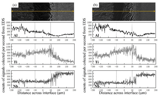 After heat treatment, no obvious changes in the shape of the elemental distribution curves were observed, with the exception of the broadening of the interlayer width. Thus, the elements underwent further diffusion, but distribution regularities of Ti, Al, and Nb remained unchanged.
