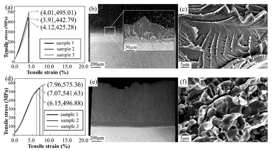 Since as-welded joints have no direct practical applications, only heat-treated joints were selected for tensile testing. The average tensile strengths were estimated to be 454 ± 41 MPa at room temperature and 538 ± 42 MPa at 650 °C. The stress–strain curve data are displayed in Figure 6a,d.