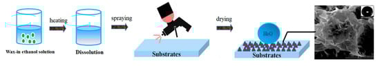 As shown in Figure 1, the soybean wax suspension was prepared thorough mixture of 1 g of soybean wax and 50 mL ethanol solution followed by heating at 65 ℃ for 3 min. The hot wax suspension was sprayed (Flying Boat Glass Co. LTD, Yancheng, China) onto glass slides (Zhejiang Pride Electric Appliance Co. LTD, Jinhua, China) with a distance of 50 cm. Finally, the coated surface was dried at room temperature to obtain its superhydrophobic characteristics.