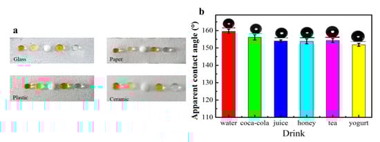 (a) Photographs of Coca Cola, black tea, yogurt, honey and water droplets on different coated materials and (b) the apparent contact angles and sliding angles of different liquid food on coated glass.