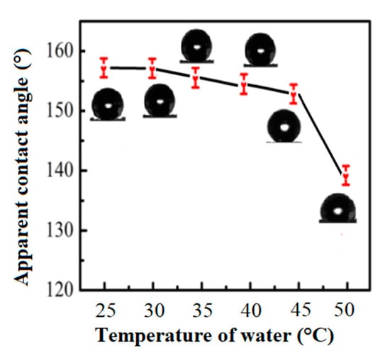 The heat resistance of the coated surface was studied by immersing the treated glass in water heated by electric-heated thermostatic water bath (Spring Instrument. Co., LTD, Jintan, China) for 10 min. After contacting with hot water from 25 to 50 °C, the apparent contact angle was determined every 5 °C. As shown in Figure 6, The coated surface kept superhydrophobic when the water bath increased from 25 °C to 45 °C. When the water temperature increased to 50 °C, the coated surface lost its superhydrophobicity with apparent contact angle lower than 150°. The soybean wax, with the melting point of 52 °C, is a kind of phase change material. The partial disappearance of the rough structure happened when the temperature was close to 50 °C, which reduced the apparent contact angle of droplet on the surface. More research is needed to improve the robustness of soybean wax towards hot water above 50°C, which is an important factor for its practical applications.
