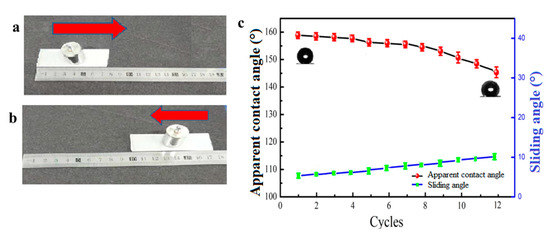 (a,b) One abrasion test cycle and(c) the change of apparent contact angle and sliding angle after cycles of abrasion.