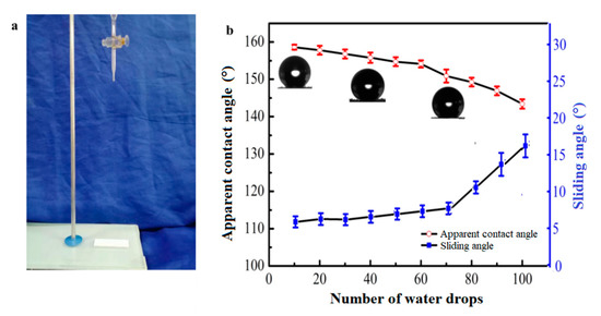 (a) The device used for an impact resistance test; (b) the change of apparent contact angle and sliding angle after water impact.