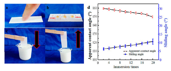 (a) The durability test by pressing with a finger; (b) photograph of water droplets after touching; (c) one-time immersion in yogurt and (d) the change of apparent contact angle and sliding angle of the treated surface plotted against immersion times in yogurt.