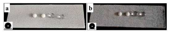 Apart from sandpaper abrasion, the impact resistance of the soybean wax coated surface was evaluated by water dropping from a height of 30 cm (Figure 9a). The apparent contact angle and sliding angle were measured every 10 drops. The change of apparent contact angle and sliding angle after water impact are shown in Figure 9b. The coating maintained excellent water repellency after 70 drops with excellent superhydrophobicity. Then, the apparent contact angle decreased to less than 150°. The impact resistance of the coated surface was crucial for its application in liquid packaging.