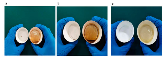 Photographs of (left) remaining viscous liquid after pouring in a soybean wax coated cup and (right) original cup: (a) milky tea; (b) chocolate syrup and (c) honey.