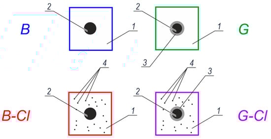 Four groups of reinforced concrete test elements used in tests: 1—concrete without additives, 2—black steel, 3—zinc coating on reinforcing steel, and 4—chlorides in concrete.