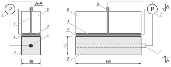 Polarization measurements of the reinforcement in concrete test elements were conducted in a three-electrode arrangement illustrated in Figure 2. Galvanized or black steel rebar 1 embedded in concrete 2 with or without chloride additives served as the working electrode. The auxiliary electrode 3 was made of a 2 mm thick stainless-steel sheet having the dimensions of 140 mm × 40 mm. A wet felt 4 with the dimensions of 140 cm × 40 cm provided the electric contact between the sheet 3 and the top surface of concrete. The reference electrode 5 (Cl−/AgCl,Ag) was placed in a vertical ballast guide 6 to provide its stabilisation during tests. The ballast 6 was used to provide the proper adhesion of the auxiliary electrode 3 through the felt 4 to the top surface of the concrete specimen 2. All three electrodes were connected to the potentiostat 7 Gamry Reference 600.