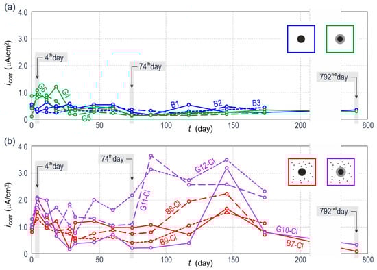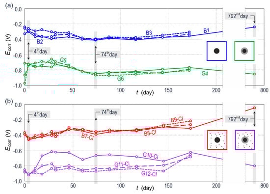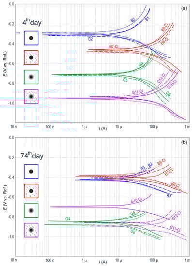 Potentiodynamic polarization curves for steel reinforcement in concrete from 12 specimens (a) on day 4 and (b) on day 74 of measurements: B—black steel in concrete without additives, G—galvanized steel in concrete without additives, B-Cl—black steel in concrete with chlorides, and G-Cl—galvanized steel in concrete with chlorides.
