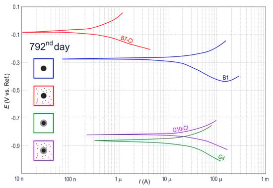 Potentiodynamic polarization curves for the steel reinforcement in concrete from four specimens on day 792, directly before microscopic tests: B1—black steel in concrete without additives, G4—galvanized steel in concrete without additives, B7-Cl—black steel in concrete with chlorides, and G10-Cl—galvanized steel in concrete with chlorides.