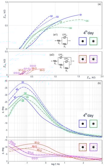 Results from impedance testing of steel reinforcement in concrete from 12 specimens on day 4 of measurements illustrated at the Nyquist (a) and Bode (b) plots, B—black steel in concrete without additives, G—galvanized steel in concrete without additives, B-Cl—black steel in concrete with chlorides, G-Cl—galvanized steel in concrete with chlorides; (a1) electrical equivalent circuit for the B and G spectrum groups, (a2) electrical equivalent circuit for the B-Cl and G-Cl spectrum groups.