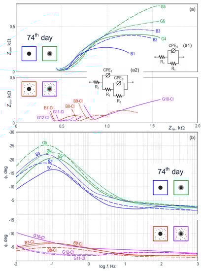 For the specimens of concrete with chlorides, day 74 of measurements revealed a small drop in the intensity of corrosion processes of galvanized and black steel. The presented deduction resulted from the quantitative analysis on the basis of the equivalent electrical circuits illustrated in Figure 7(a1,a2), similar to diagrams shown in Figure 6(a1,a2). That phenomenon could be explained by a gradual accumulation of corrosion products of iron and zinc on the surface of steel reinforcement in the specimen, which additionally were deposited in concrete pores. Dissolution of metals (Fe and Zn) was slightly inhibited mainly due to the limited access of oxygen to the surface of both metals.
