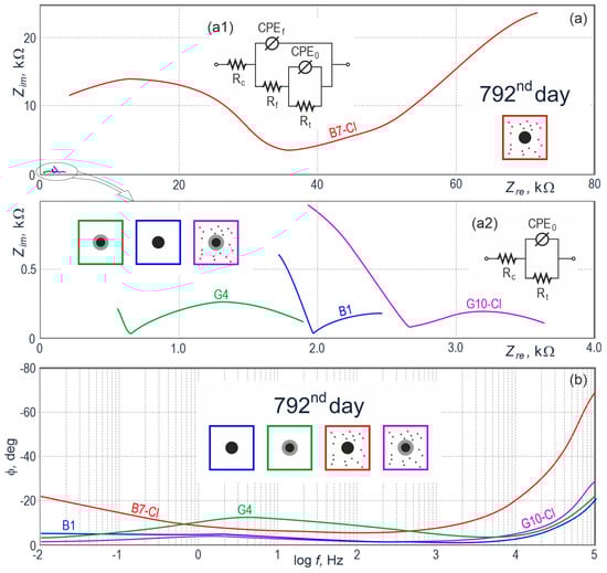 The last series of impedance measurement was made on day 792, that is, after about two years of measurements and included only four specimens (B1, G4, B7-Cl, G10-Cl) being the one-element representation of all four groups (B, G, B-Cl, G-Cl) of test elements. The Nyquist plot (Figure 8a) shows one dominating spectrum (B7-Cl) and three considerably smaller spectra near the beginning of the coordinate system. For better clearness of the results, those three spectra are again presented below, in the second complex plane with 20-time smaller values of complex and real impedance. The clear dominance of one spectrum over others indicated the impedance of the whole steel-concrete system in the specimen B7-Cl was about 20 times greater than the impedance of the other three specimens. As all impedance measurements on the final measuring series (day 792) were conducted within a broader range of frequencies 0.01 Hz–100 kHz, particularly the spectrum B7-Cl had a rather interesting shape. It had (from the left side) a high-frequency, slightly oblate semi-circle expressing electrochemical properties of concrete, and from the point of contraflexure a rectilinear part changing into the arc shape. The last described part could indicate diffusion control over the corrosion process. The spectrum shape for B7-Cl in the complex plane and at the Bode plot demonstrated a very strong slowdown on day 792 of measurements, comparable to the situation, in which dissolution of reinforcing steel in concrete was inhibited despite the presence of aggressive chloride ions. A continuous increase in the volume of corrosion products was supposed to inhibit seriously the access of oxygen to the steel surface, and consequently to eliminate the agent required for the development of electrochemical corrosion of steel in concrete.