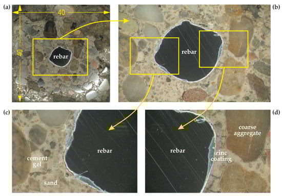 Tests on concrete-reinforcement joints began from analyzing its microstructure after completing corrosion tests, using the stereo microscope (Figure 9). Figure 9a presents the cross-section (with dimensions of 40 mm × 40 mm) of the tested concrete specimen with a galvanized rebar concreted in the central point, made of ribbed steel of grade B500SP and with a diameter of ϕ8 mm.