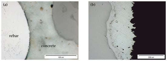 The tests conducted on the microstructure of reinforced concrete specimens using the light microscope revealed good conditions of joints between concrete and the reinforcement for rebars made of black steel (Figure 10a). And simultaneous observations confirmed previous conclusions made on the basis of tests using the stereo microscope (Figure 9) concerning the non-uniform thickness of zinc coating on rebars (Figure 10b).