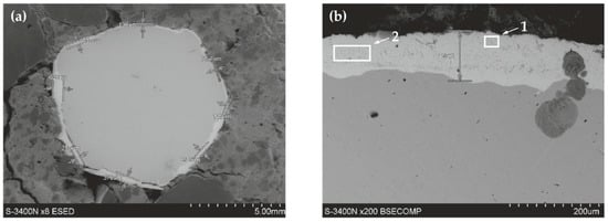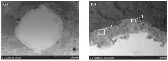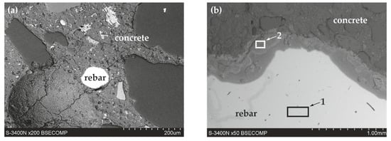 Microstructure of the joint between concrete without chlorides and reinforcement made of black steel B500SP (SEM): (a) general view of a cross-section of a steel bar in concrete (b) morphology of the boundary of separation rebar–concrete with marked places 1 and 2 for microanalysis of the chemical composition.
