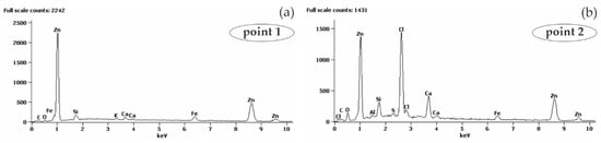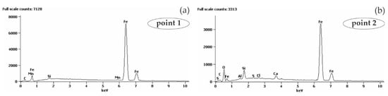 Spectra obtained from energy-dispersive X-ray spectroscopy (EDS) method for areas marked in Figure 11b: (a) from point 1 (b) from point 2.