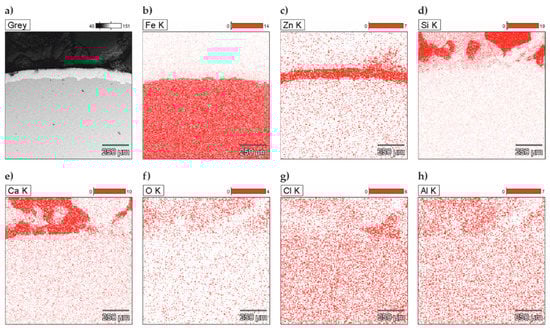 The analysis of the joint between concrete without chlorides and the reinforcing steel B500SP with zinc coating demonstrated a clear difference the coating thickness (Figure 15). It varied from more than ten (78.4 µm) to over 600 µm, but usually was within the range from 150 µm to 250 µm. The thickest zinc coating (620 µm) was near one of oblique ribs of the rebar. The variable thickness of the zinc coating is an effect directly resulting from the technology of the galvanizing process, but it can also be the result of the preparation of metallographic samples—the zinc “rubs” on the surface of the specimen. In this case, it is the effect of galvanizing technology. The analysis of chemical composition for the section of the zinc coating indicated its great uniformity (Figure 16). That result was confirmed by testing the relative concentration elements on the surface (mapping) of the concrete-rebar joint (Figure 17).