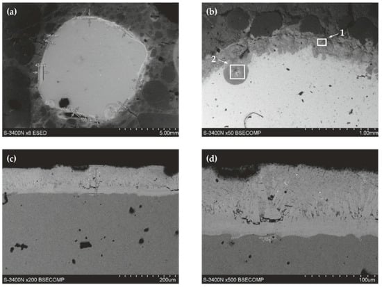 Figure 9b illustrates the close-up of the cross-section of steel rebar with a clearly visible, thin, silver and circumferential zinc coating. There are noticeable particles of coarse and fine (sand) aggregates near the rebar. Aggregates are tied together with cement gel. Figure 9c,d show another close-up of a strongly diversified thickness of the zinc coating, whose thickest layer is observed near oblique ribs of the reinforcing steel.