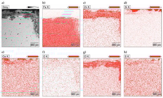 (a) Microstructure of the surface of tested concrete without chlorides—reinforcing steel B500SP with zinc coating (SEM) and relative concentrations of elements on the surface (mapping): (b) Fe, (c) Zn, (d) Si, (e) Ca, (f) O, (g) Cl, and (h) Al (EDS).
