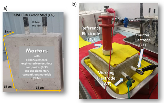 Prismatic mortar specimens with dimensions of 9 × 15 × 15 cm (Figure 1a) were manufactured with two rebars embedded in the mortars. The AISI 1018 carbon steel (CS) was used as bars and had a length of 15 cm and 9.5 mm diameter. A conventional three-electrode cell configuration (Figure 1b) was used for the electrochemical studies, which consisted of a two nominally identical electrodes (CS bars) as working electrode (WE) and counter electrode (CE), a copper–copper sulfate (Cu/CuSO4) electrode, respectively. Electrochemical measurements were carried out using a Gill-AC potentiostat/galvanostat/ZRA from ACM Instruments (Manchester, UK). Corrosion experiments were performed by immersion in 3.5 wt % of NaCl and Na2SO4 solutions, for 12 months, at room temperature. The electrochemical tests were performance in triplicate.