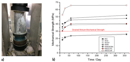 Compressive strength of mortars. (a) Test according to ASTM C39 [42]. (b) Measuring at ages 7, 14, 60, and 360 days.